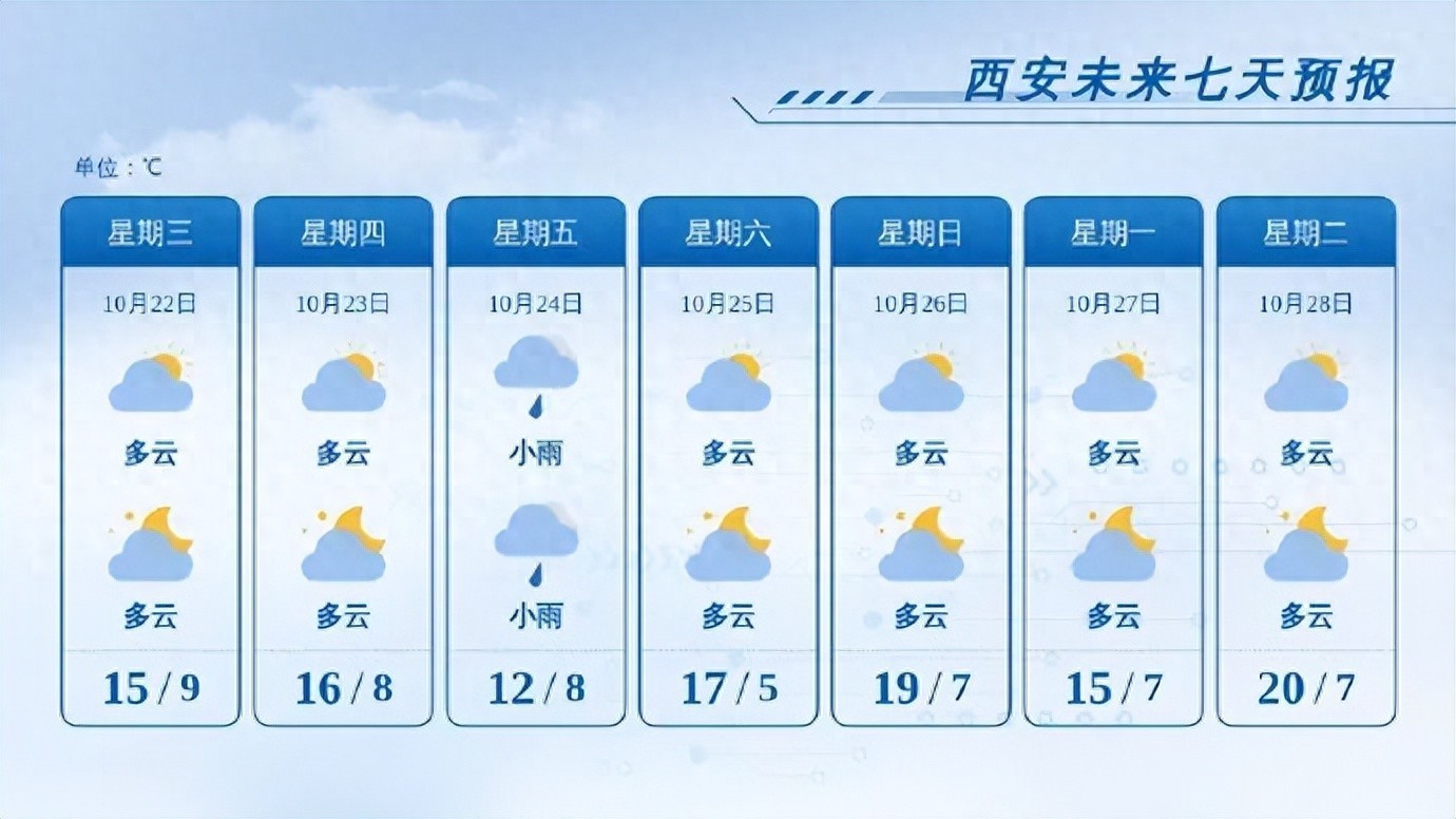 未来三天西安市云量较多,以阴到多云为主,其中24日下午至25日上午有一次小雨天气,其余时段无明显降雨。受回流冷空气影响,未来三天最高气温维持在11℃~13℃,最低气温8℃~9℃,体感较冷,请注意及时增衣保暖。
