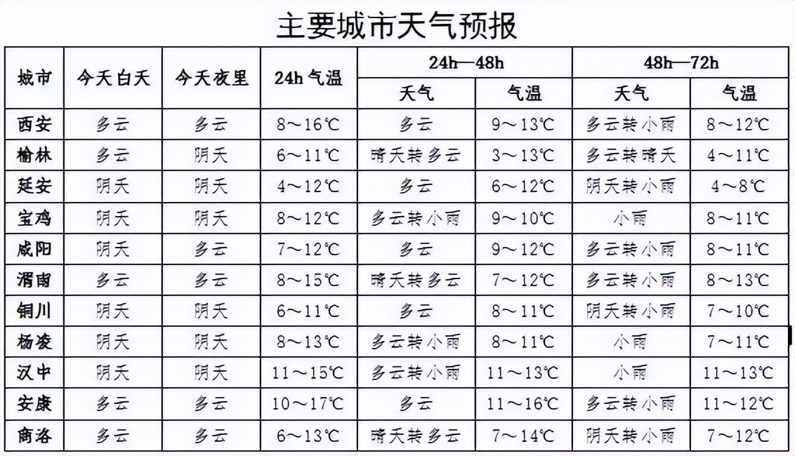 23日:全省阴天间多云,陕北南部有分散性小雨或阵雨(0.1~1毫米),关中、陕南西部有小雨(1~10毫米)。